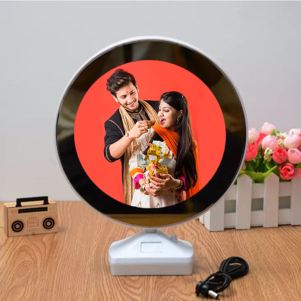 A perfect personalised 3 in 1 gift that serves the purpose of the mirror and photo frame with LED light. It can also be used as a lamp at night.