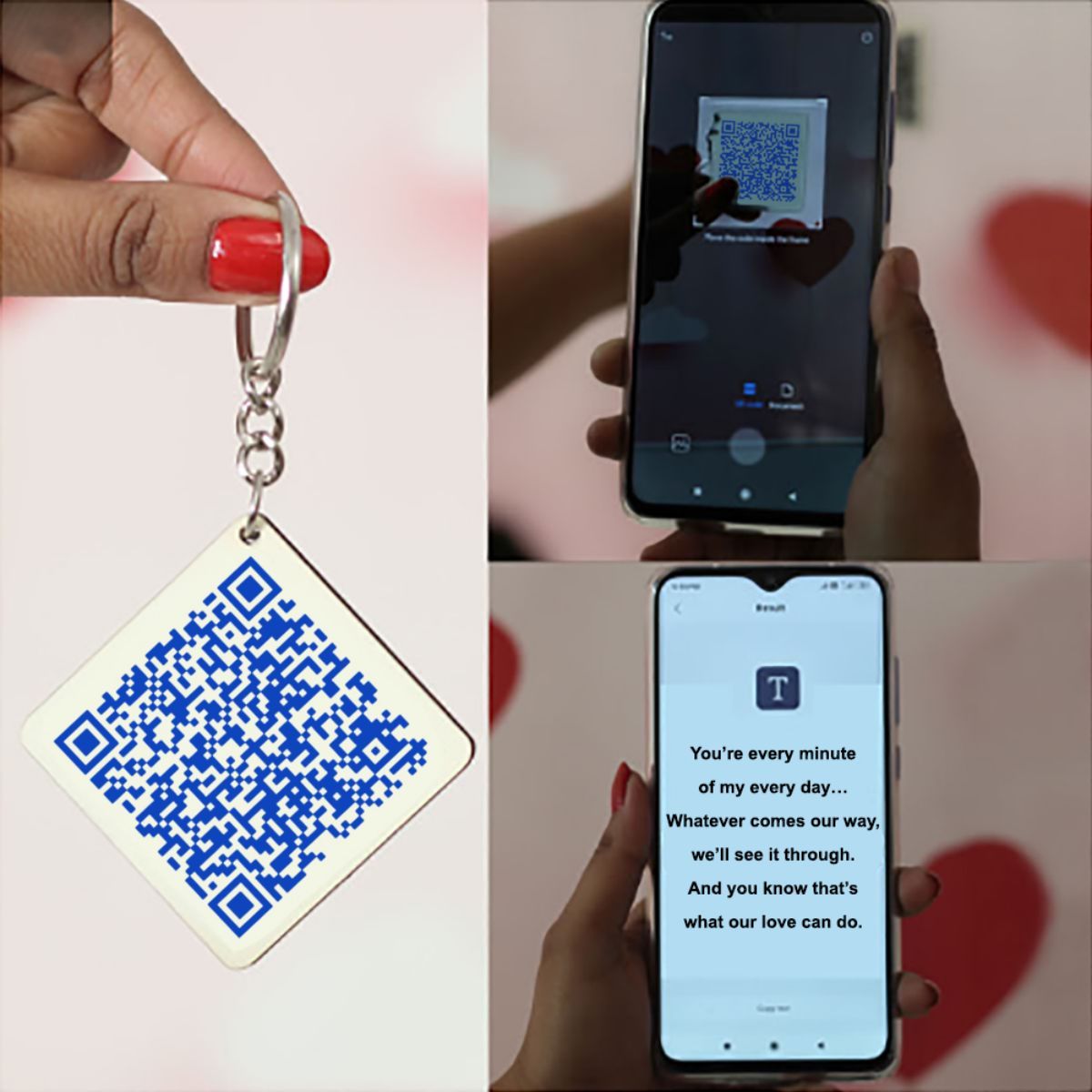 Your message is now safely encoded in the QR code, waiting to be decoded by the special person. Send us your message for any occasion and we will customize it with a QR code on a keychain.